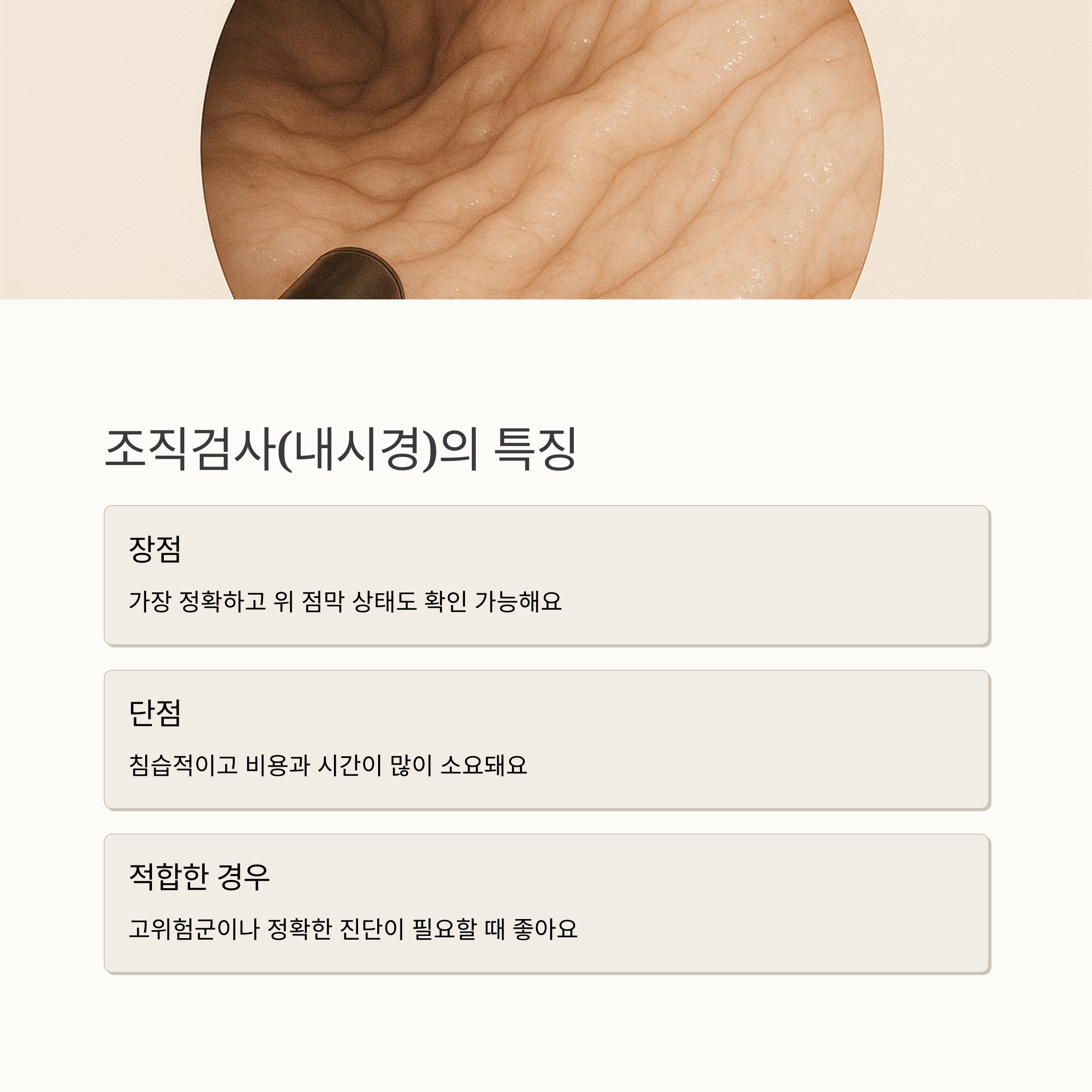 마지막으로 조직검사는 내시경 검사를 통해 위 점막을 직접 채취하여 헬리코박터균의 존재 여부를 현미경으로 확인하는 검사에요. 세 가지 검사 중 가장 정확하고, 위 점막의 염증 상태까지 동시에 확인할 수 있다는 큰 장점이 있지만, 침습적인 검사이고 비용과 시간이 많이 소요될 수 있다는 점은 감수해야 해요.