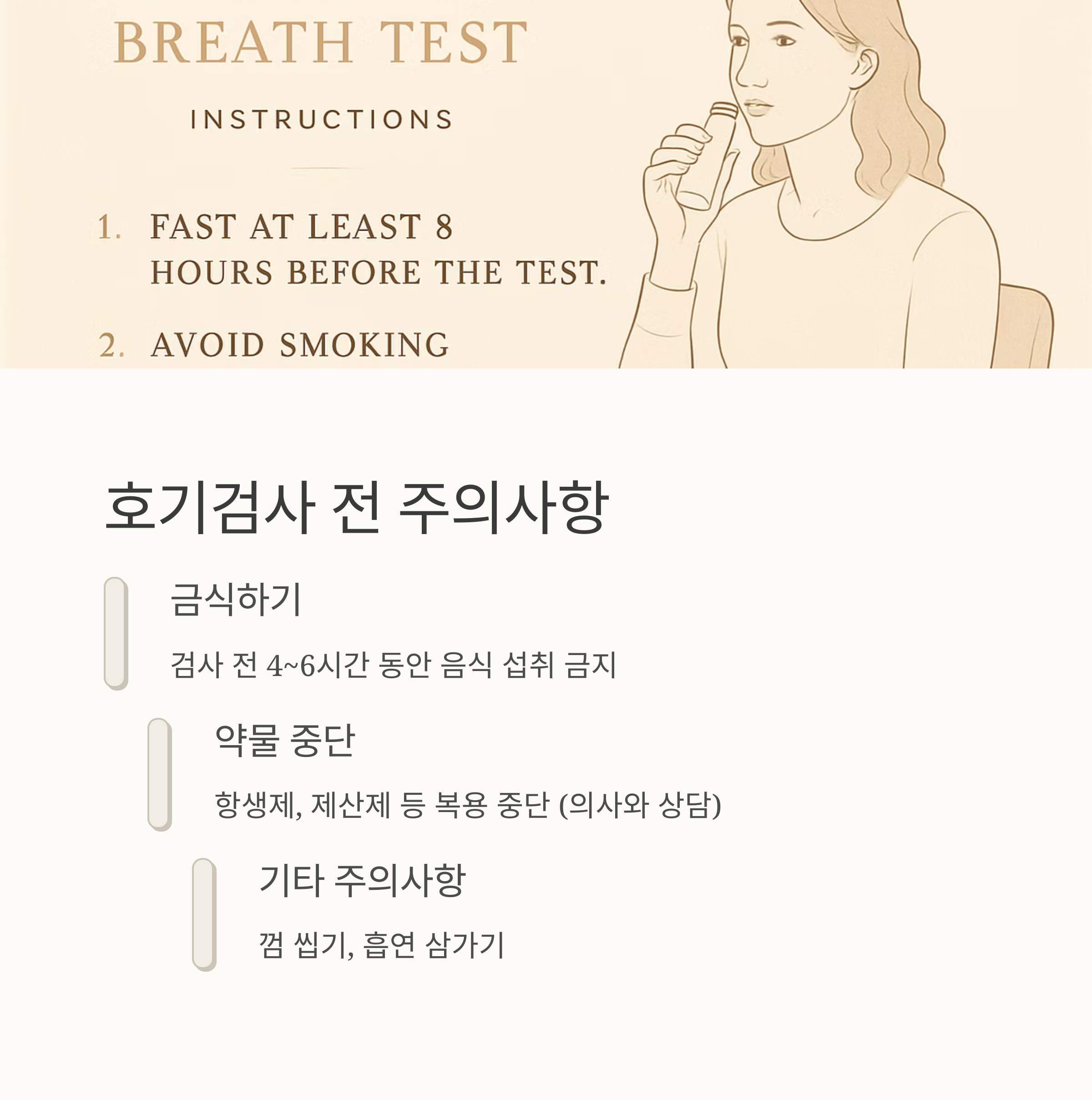 검사와 관련된 궁금증을 풀어드릴게요. 호기 검사는 공복 상태에서 받아야 해요. 검사 전 4~6시간 동안은 금식을 하고, 약물 복용, 껌, 흡연도 삼가야 정확한 결과를 얻을 수 있답니다.