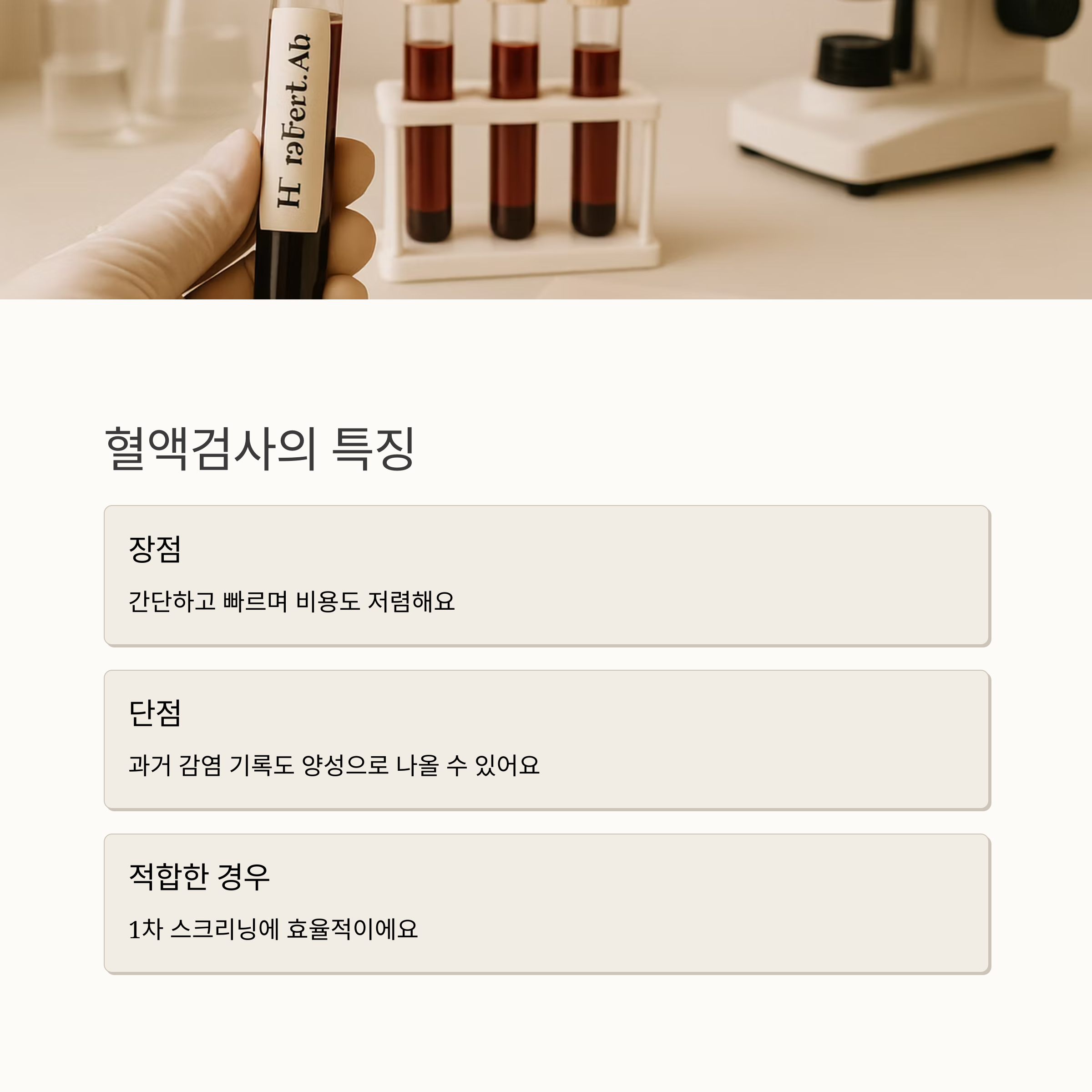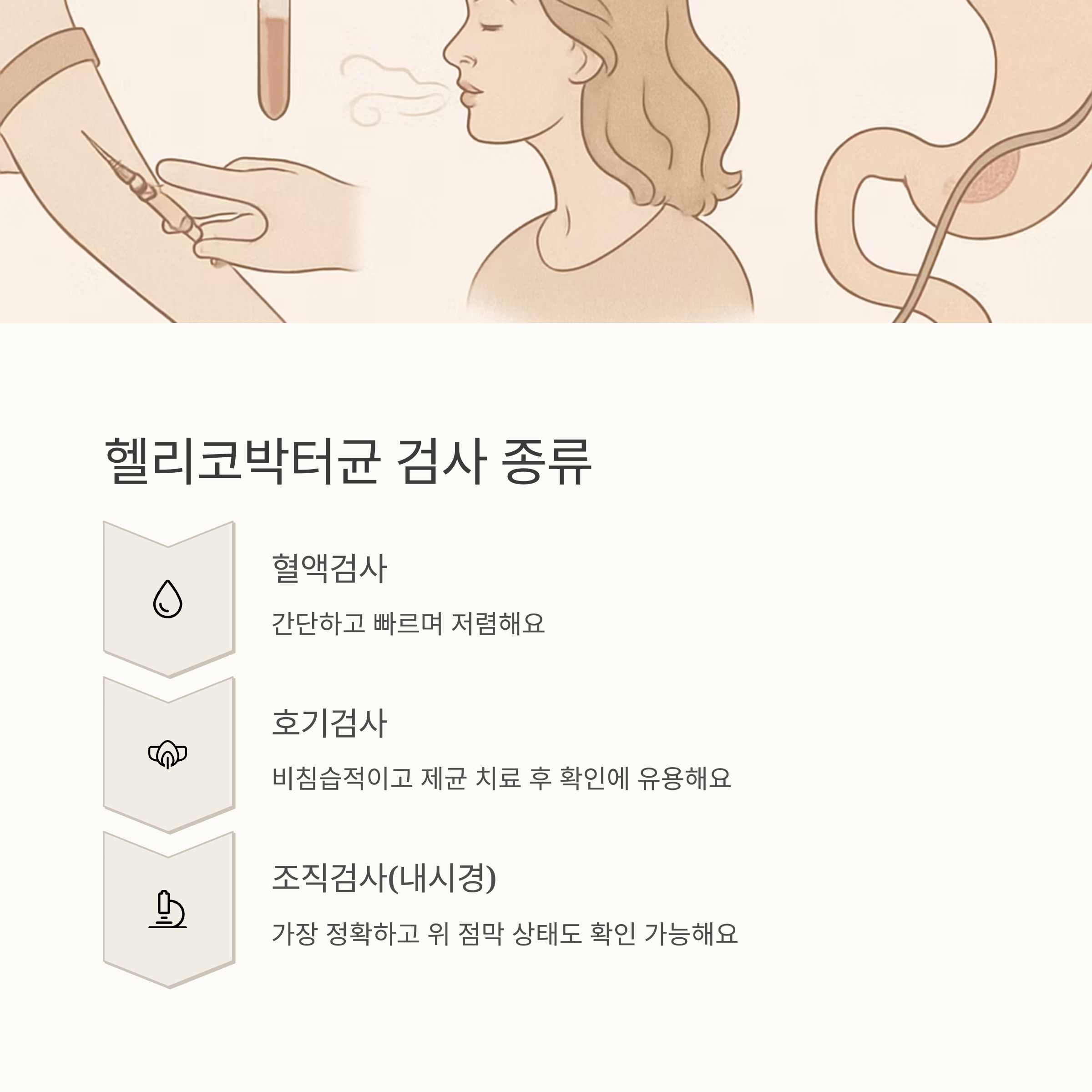 검사는 크게 혈액검사, 호기검사, 그리고 조직검사(내시경) 세 가지로 나뉘어요. 각각의 검사 방법과 장단점을 비교해 보면서, 어떤 검사가 나에게 가장 적합한지 판단해 볼 수 있겠죠.