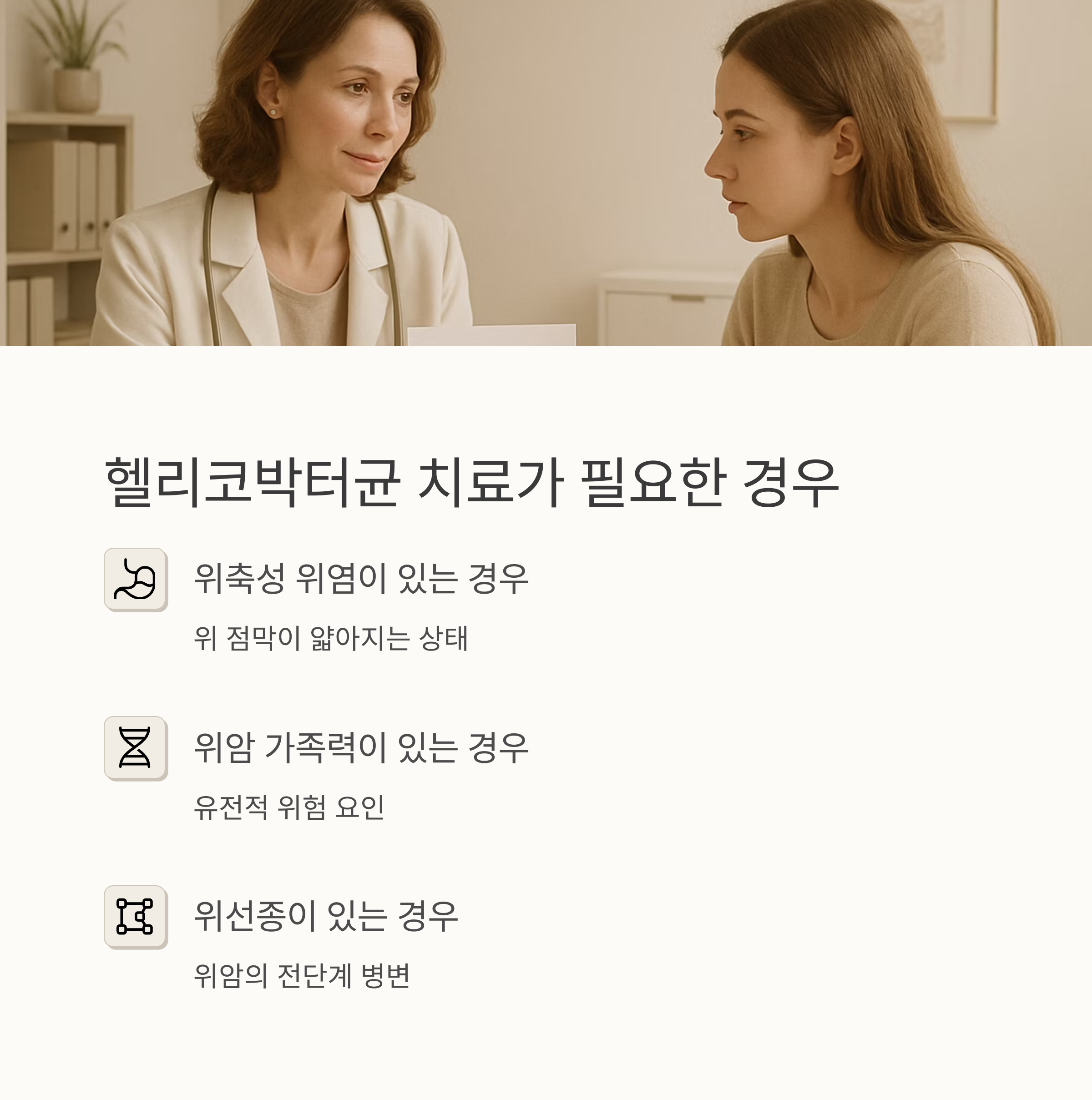 헬리코박터균 감염이 확인되면, 치료를 받아야 할까요? 증상이 없더라도 위암 위험이 높은 경우, 즉 위축성 위염이나 위선종이 있거나, 가족력이 있다면 적극적인 치료가 권장됩니다. 하지만, 증상이 없고 위암 위험도 낮다면 의사와 상의하여 치료 여부를 결정하는 것이 중요해요. 제균 치료를 받더라도 재감염될 가능성은 완전히 배제할 수 없어요. 건강한 식습관과 위생 관리를 통해 재감염을 예방하는 노력이 필요합니다.