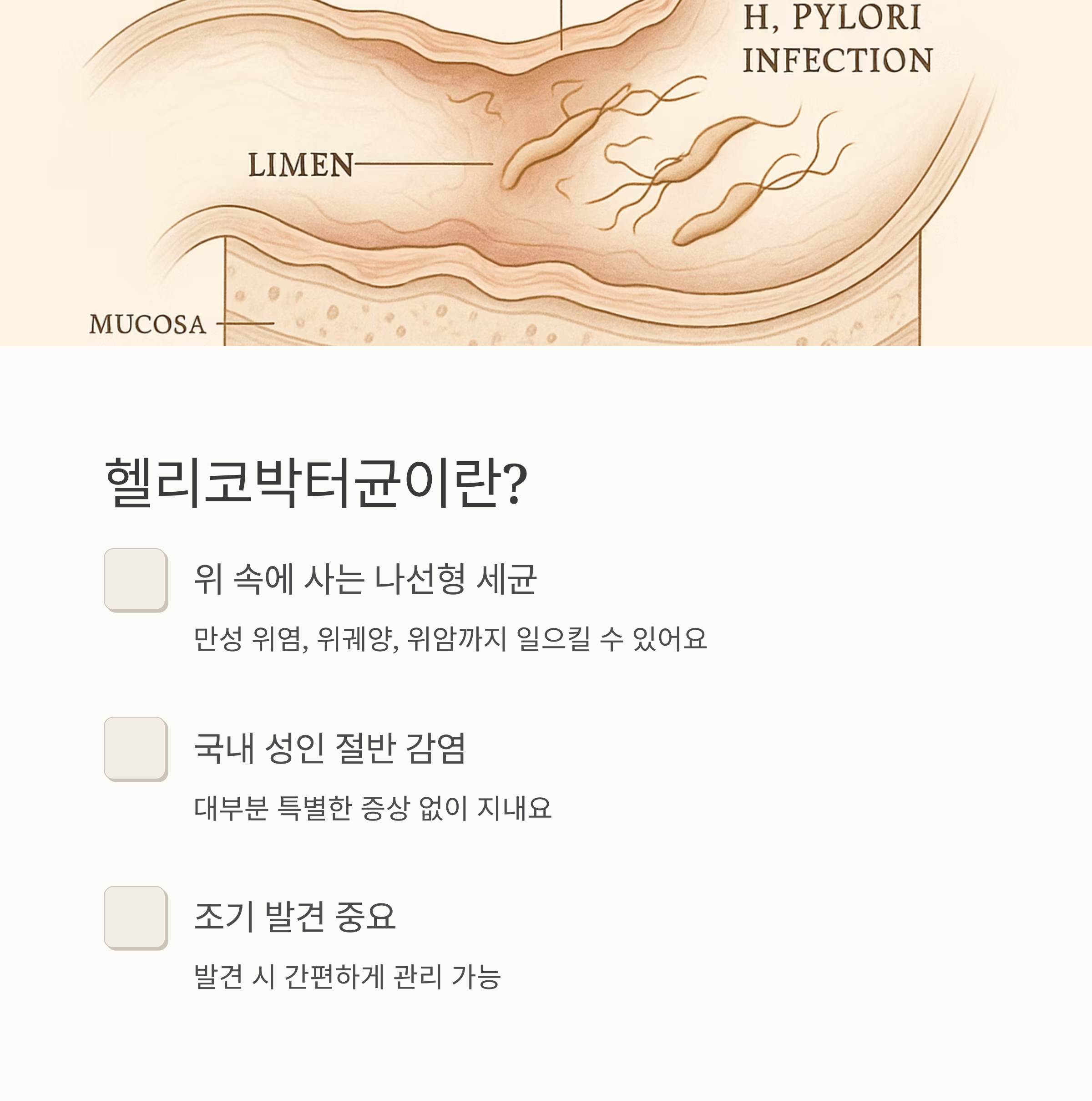 무서운 소리 같지만, 다행히도 이 균은 검사를 통해 확인하고 치료할 수 있어요. 국내 성인의 절반 정도가 감염되어 있을 만큼 흔하지만, 대부분은 특별한 증상 없이 지내다가 건강검진이나 다른 이유로 검사를 받으면서 발견하는 경우가 많아요.