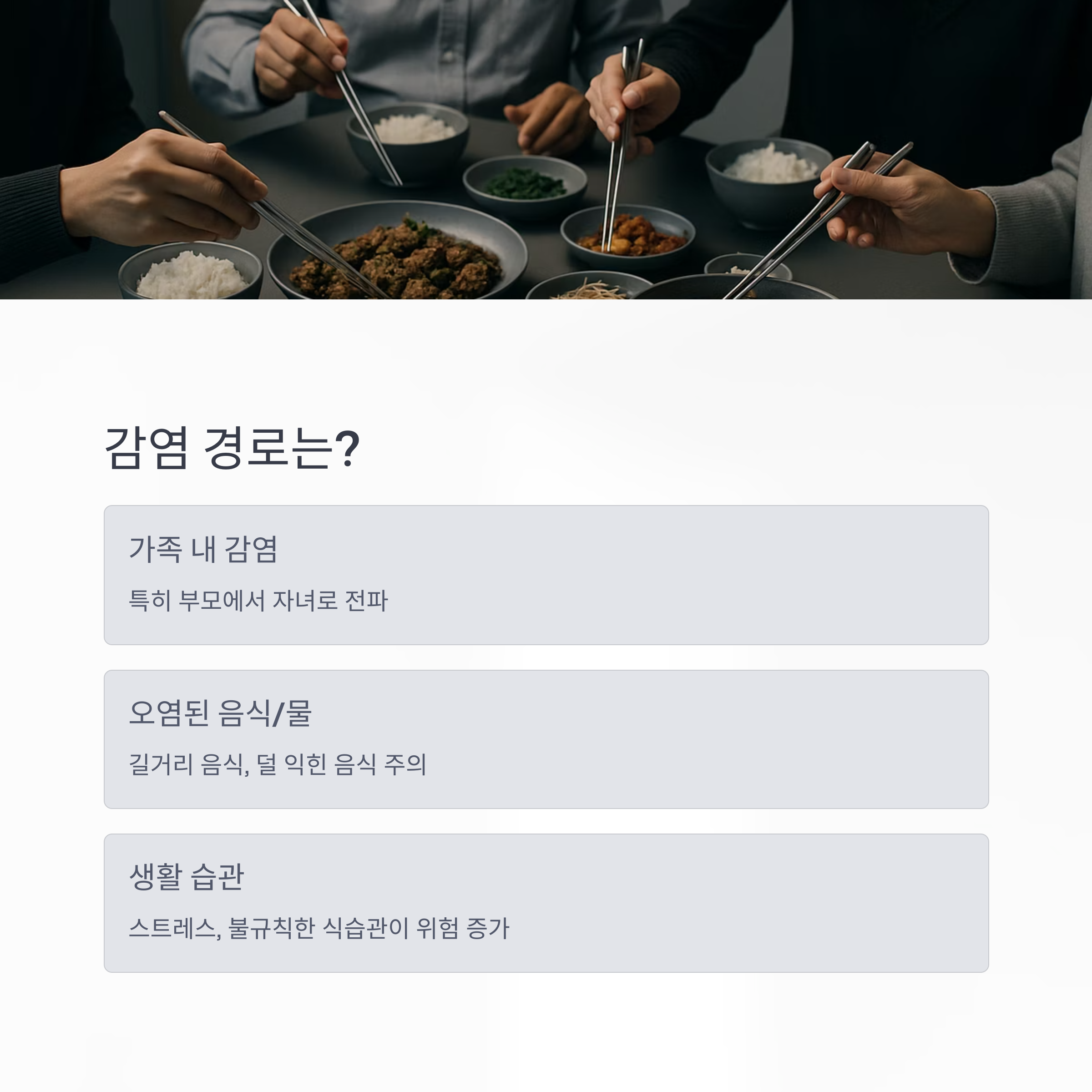 헬리코박터균은 어떻게 우리 몸속으로 들어오는 걸까요? 가장 흔한 경로는 가족 내 감염이에요. 특히 어린 아이들은 부모님으로부터 균을 옮겨 받을 확률이 높다고 해요. 음식을 같이 먹거나 수저를 함께 사용하면서 쉽게 전파될 수 있으니 주의해야겠죠. 뿐만 아니라 오염된 음식이나 물을 통해서도 감염될 수 있답니다.