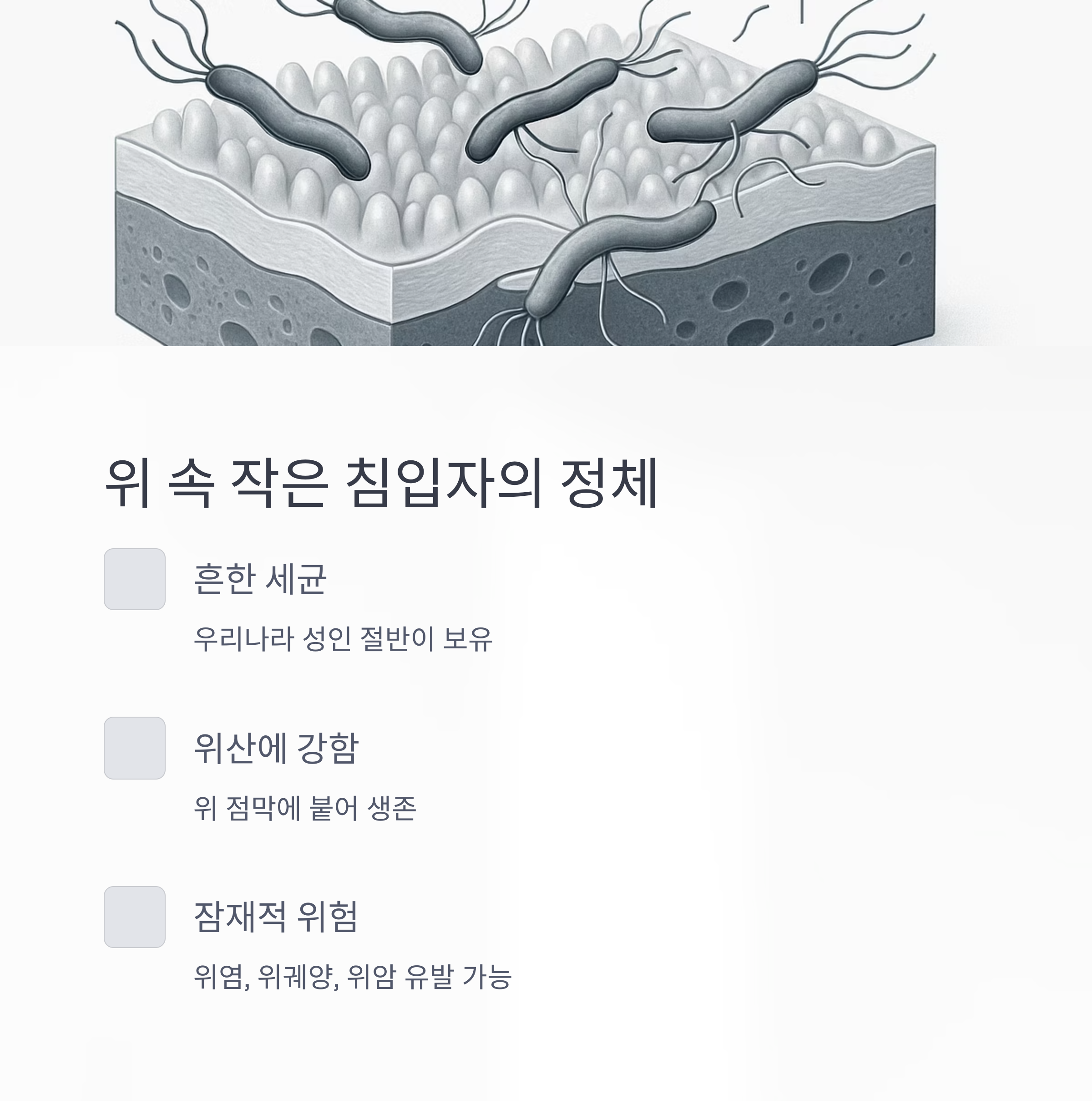 어휴, 건강검진 결과 헬리코박터균 양성이라니 괜히 마음이 불안하시죠? 사실 헬리코박터균은 우리 주변에 아주 흔한 세균이에요. 우리나라 성인 절반 정도가 가지고 있을 만큼 흔하지만, 모두가 위험한 건 아니랍니다. 마치 잠복해 있다가 어떤 계기가 생기면 활동하는 숨은 능력자 같은 존재라고 생각하면 이해가 쉬울 거예요.