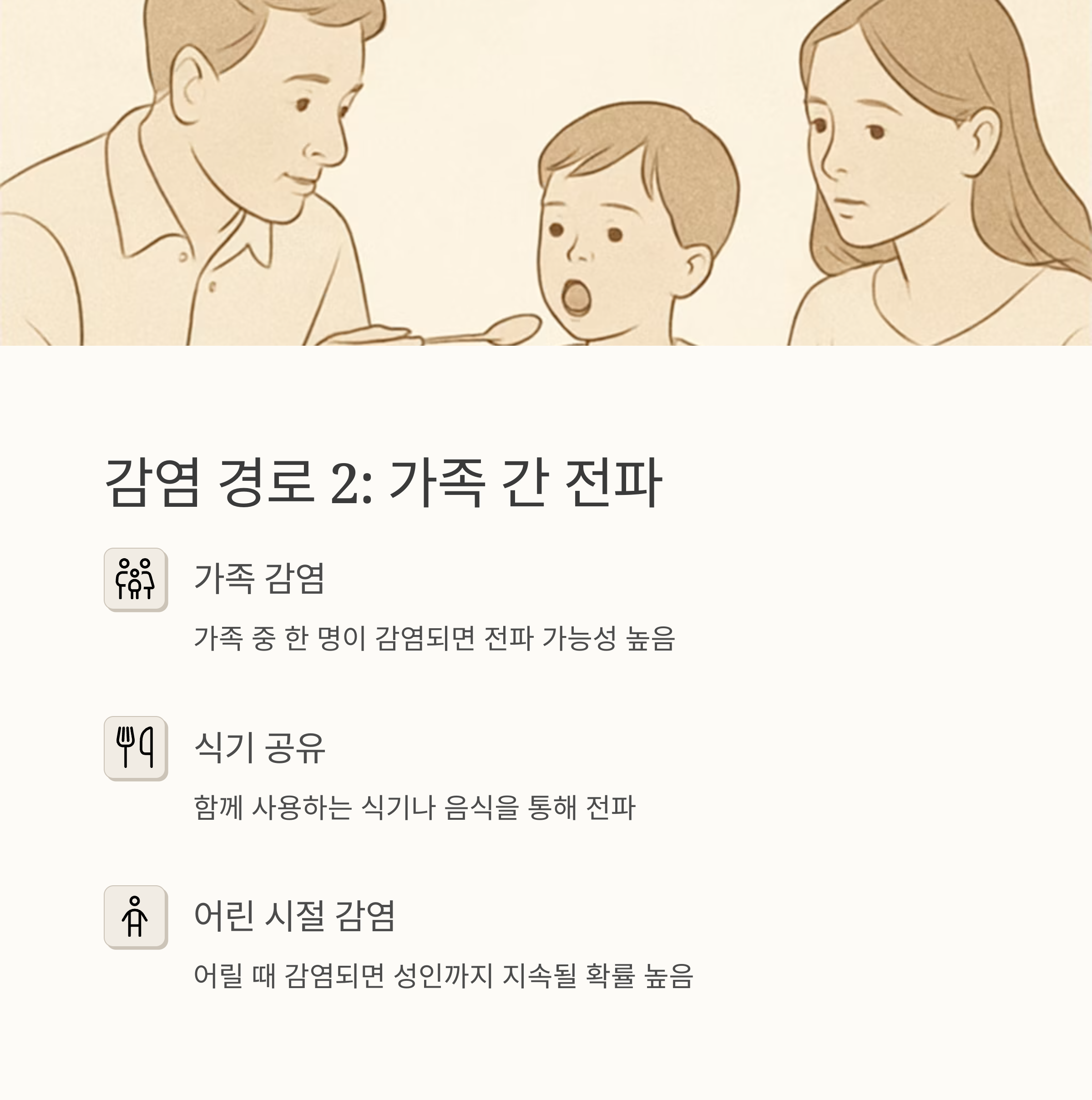헬리코박터균은 주로 오염된 음식이나 물을 통해 감염됩니다. 가족 구성원 중 한 명이 감염된 경우, 식기를 함께 사용하거나 음식을 나눠 먹으면서 감염될 가능성이 매우 높아요. 특히 어릴 때 감염되면 성인이 되어서도 몸속에 남아있을 확률이 높다고 합니다. 또, 손 씻기를 잘 하지 않거나 위생 상태가 좋지 않은 환경에서도 감염 위험이 높아집니다.