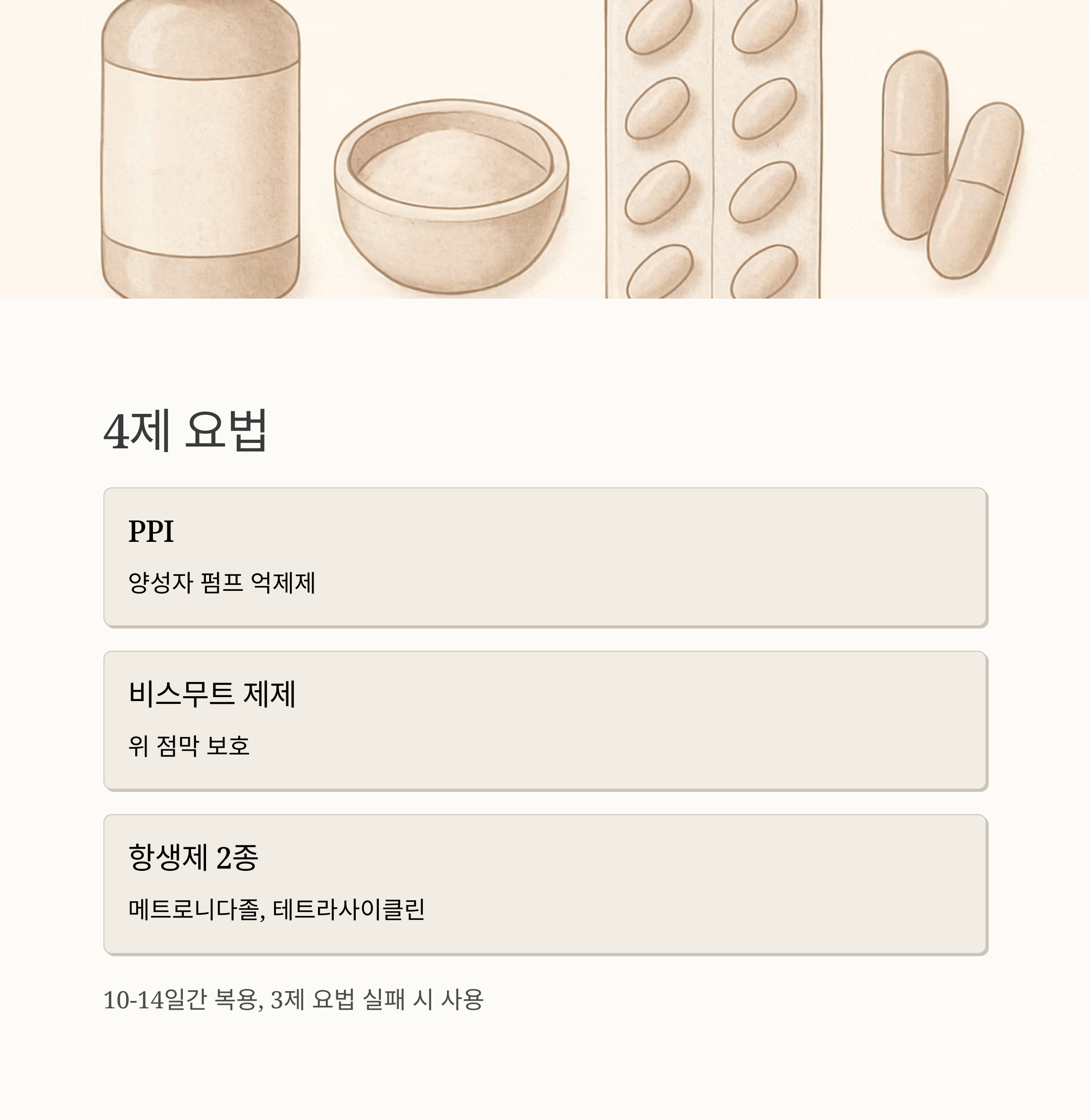 헬리코박터균이 발견되면 제균 치료가 필요합니다. 단순히 증상만 완화하는 것이 아니라, 위암을 예방하고 궤양 재발을 막기 위해서죠. 일반적으로는 3제 요법이나 4제 요법을 사용하는데요, 3제 요법은 양성자 펌프 억제제(PPI), 클라리스로마이신, 아목시실린(혹은 메트로니다졸)을 함께 복용하는 방법입니다.