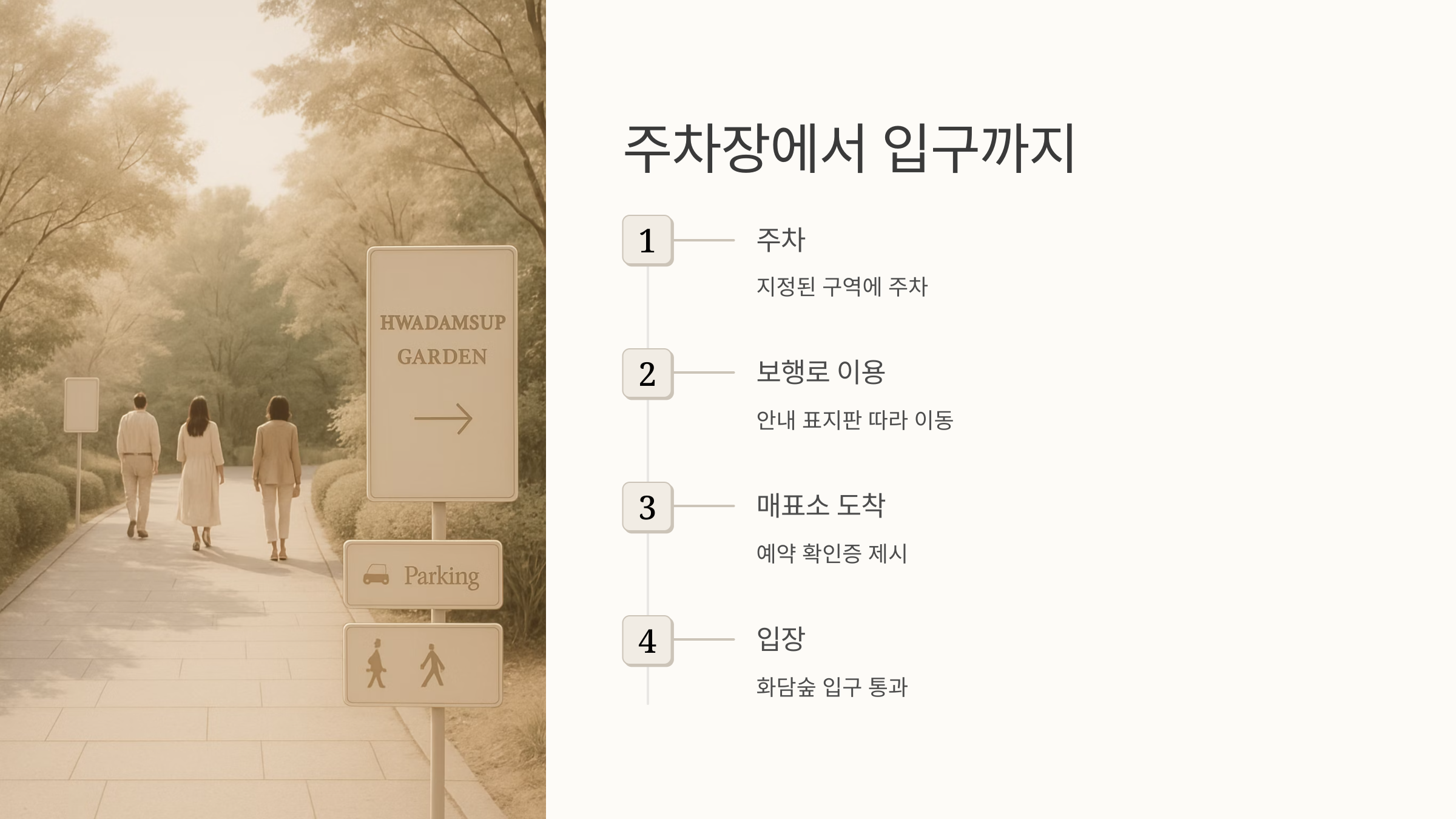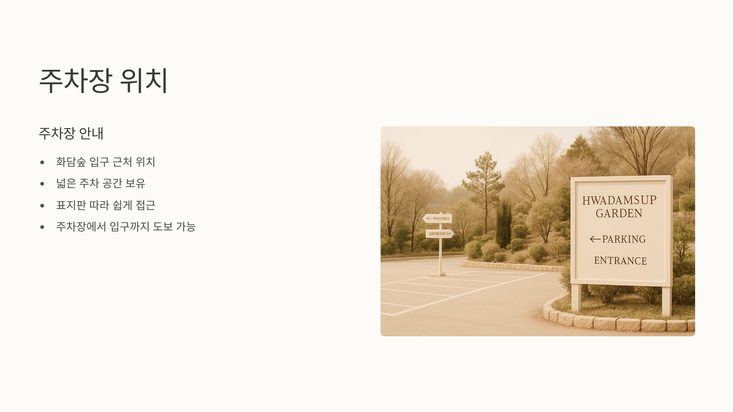 화담숲 방문 시 주차는 어떻게 해야 할까요? 걱정 마세요. 화담숲에는 넓은 주차장이 마련되어 있어요. 주차장 위치는 화담숲 입구 바로 근처에 있으니 찾기 어렵지 않답니다.