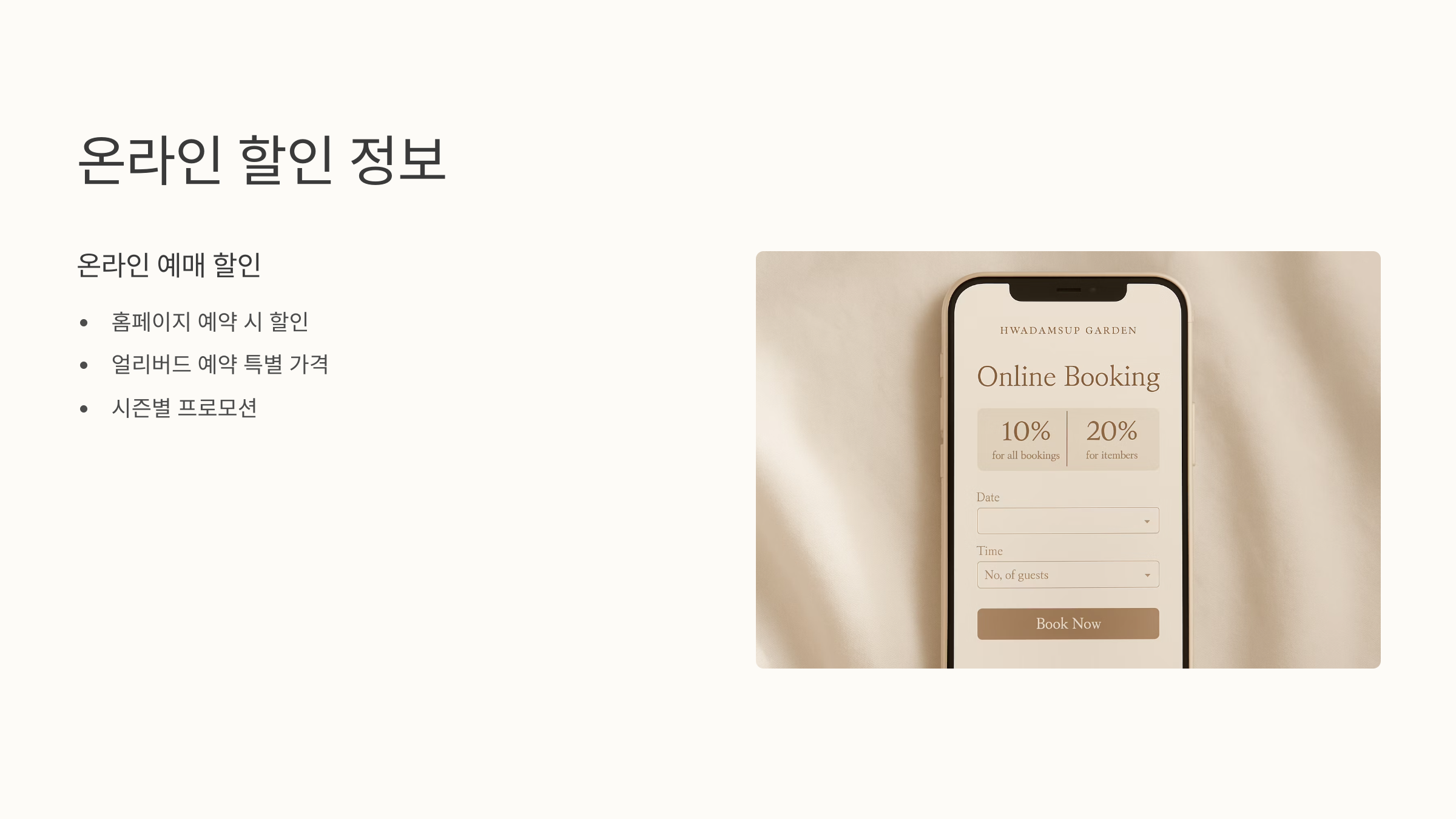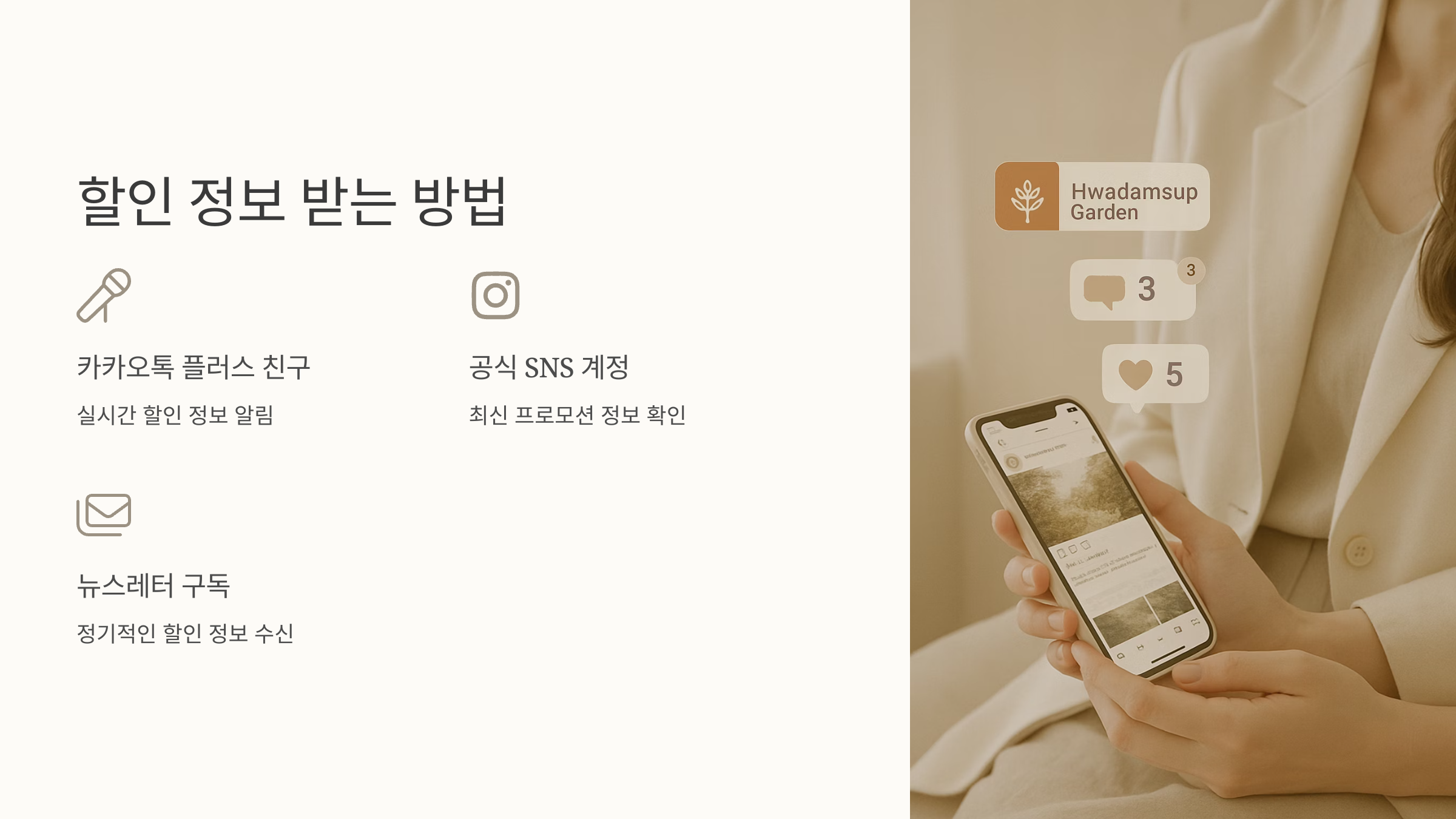 또, 온라인 예매를 통해 할인 혜택을 받을 수 있는 경우도 많으니 홈페이지를 자주 확인해 보세요. 혹시라도 할인 정보를 놓칠까 걱정된다면, 카카오톡 플러스 친구나 화담숲 공식 SNS 계정을 팔로우하면 실시간으로 최신 할인 정보를 받아볼 수 있어요! 정보를 잘 활용해서 알뜰하게 화담숲을 즐겨보세요! 할인 정보는 시기에 따라 변동될 수 있으니 방문 전에 다시 한번 확인해 주시는 센스!