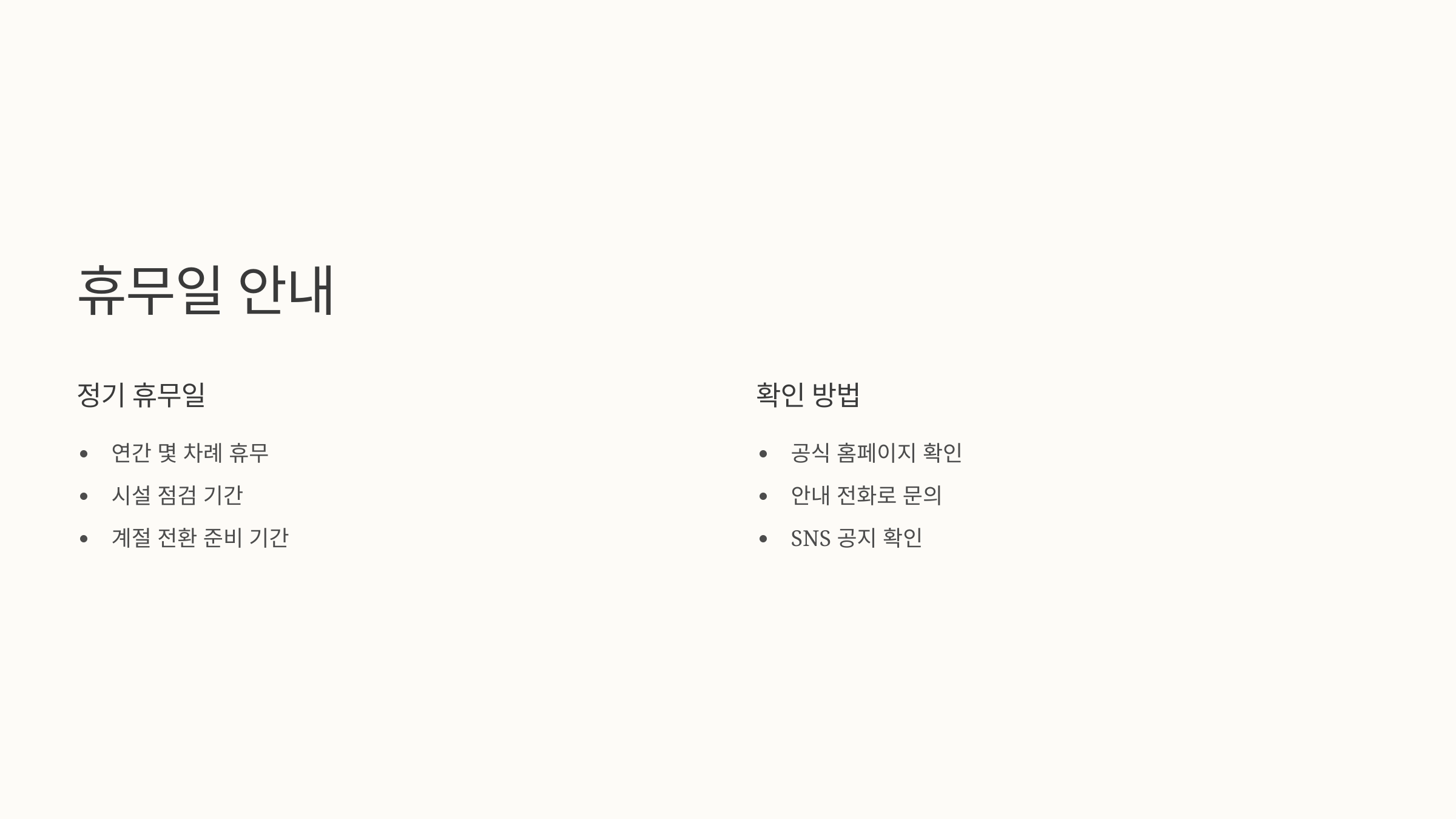 봄, 여름, 가을, 겨울… 계절마다 운영 시간이 다르니, 꼭 화담숲 공식 홈페이지나 안내 전화를 통해 확인하시는 것이 좋아요. 그리고 휴무일도 잊지 마세요. 일 년에 몇 번 휴무일이 있으니 방문 전에 확인해서 헛걸음하는 일이 없도록 해야겠죠?