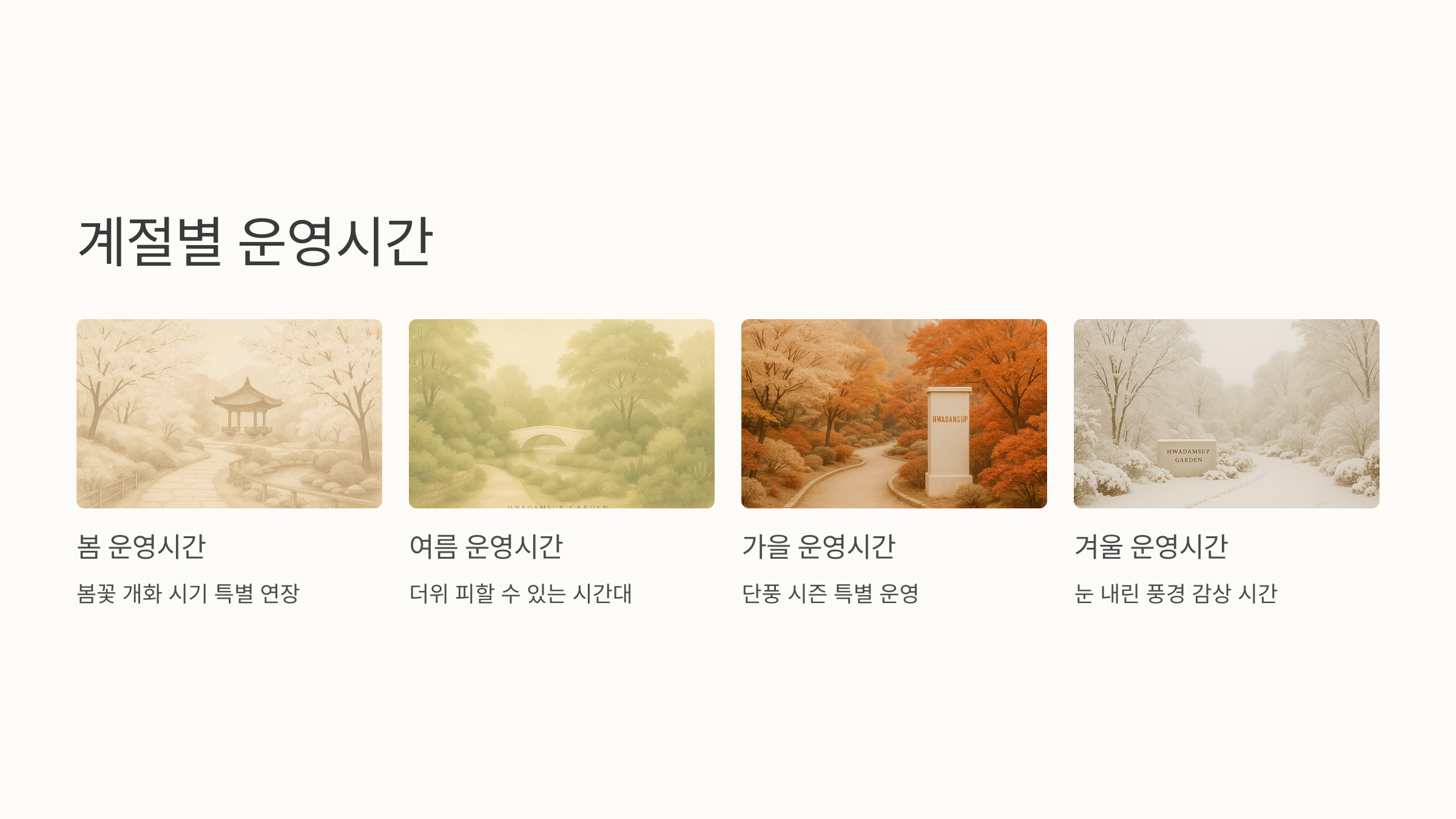 화담숲을 방문하기 전에 운영시간과 휴무일을 확인하는 것은 필수입니다. 계획 없이 갔다가 문이 닫혀있다면 얼마나 속상할까요! 화담숲의 운영시간은 계절에 따라 조금씩 다릅니다.