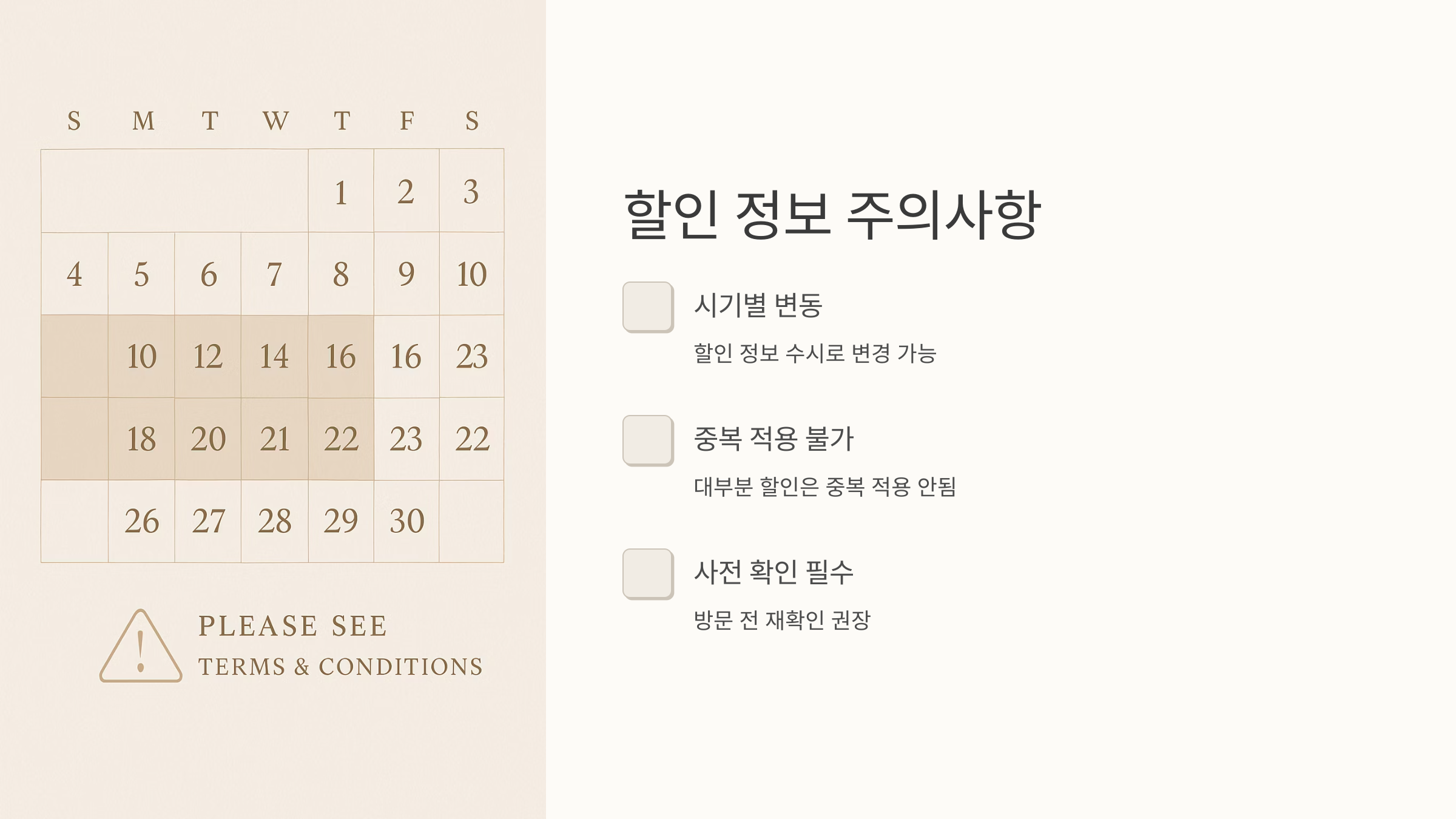 원하는 날짜와 시간을 고르고, 인원수를 입력하면 됩니다. 그리고 중요한 할인! 홈페이지에는 다양한 할인 정보가 있어요. 카드 할인, 통신사 할인, 지역 주민 할인 등등… 꼼꼼하게 확인해서 자신에게 맞는 할인을 찾아보세요.