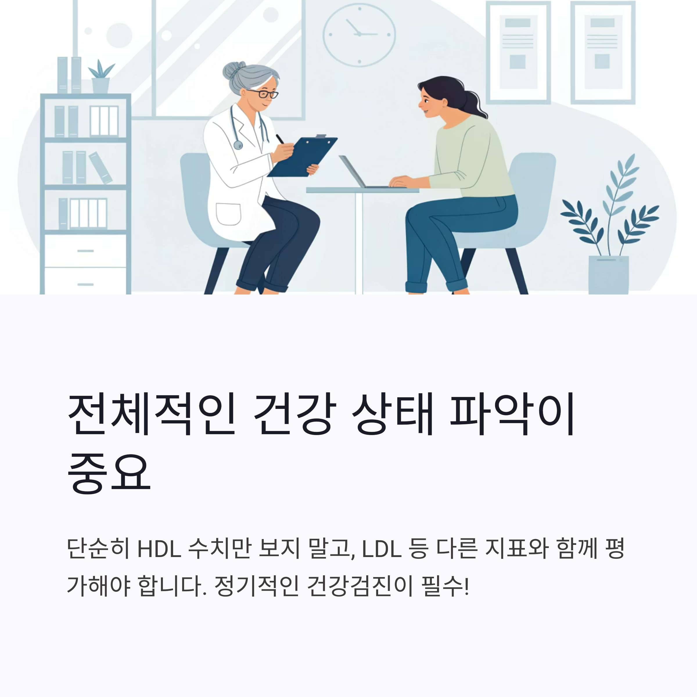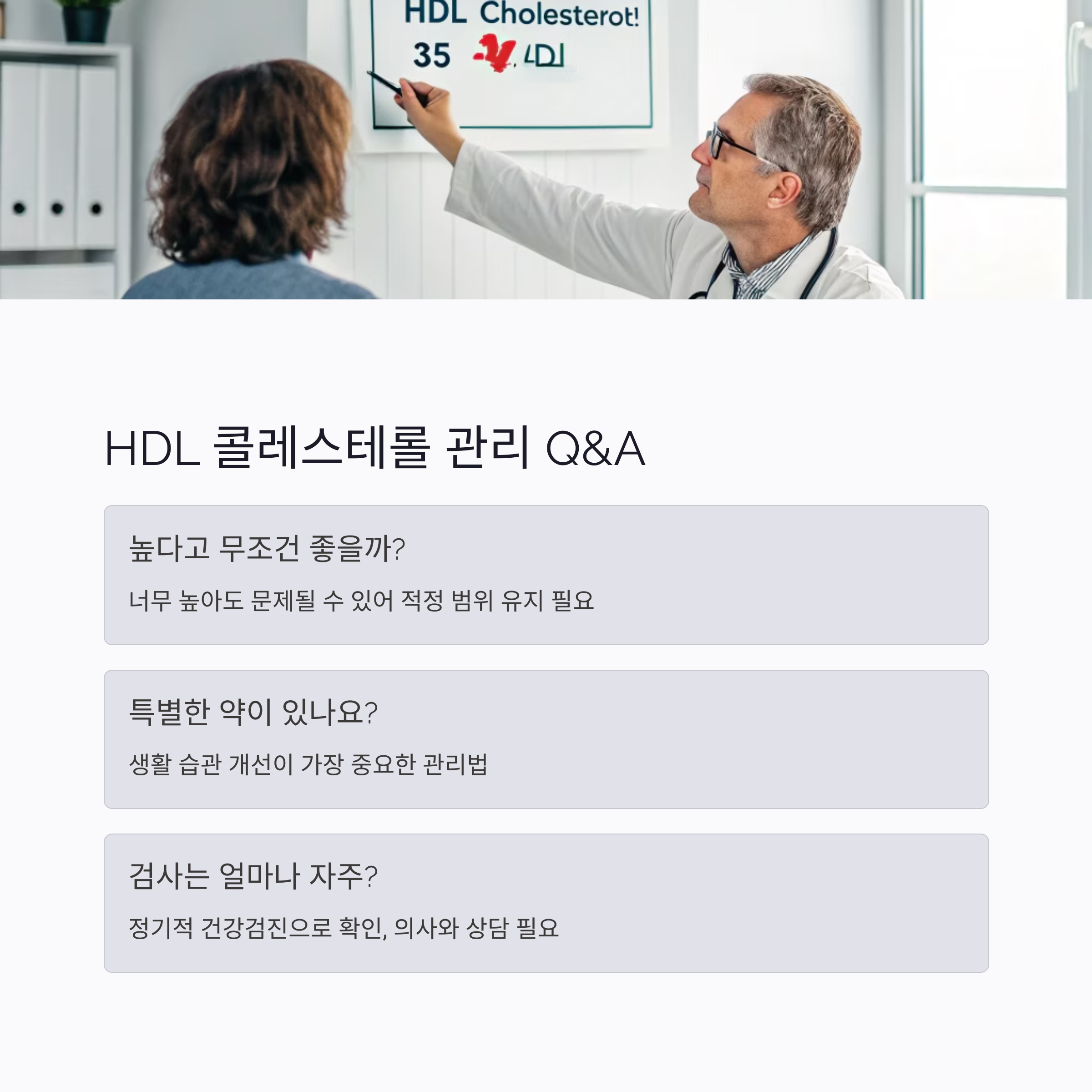 마지막으로 HDL 콜레스테롤 관리에 대한 궁금증을 풀어드릴게요. HDL 콜레스테롤 수치가 높다고 무조건 좋은 건 아니에요. 너무 높아도 문제가 될 수 있으니 적절한 범위 내에서 관리해야 합니다. 그리고 HDL 콜레스테롤을 높이는 특별한 약은 없어요. 생활 습관 개선을 통해 관리하는 것이 중요합니다. HDL 수치는 혈액 검사를 통해 측정할 수 있고요, 정기적인 건강 검진을 통해 꾸준히 확인하는 것이 좋습니다.