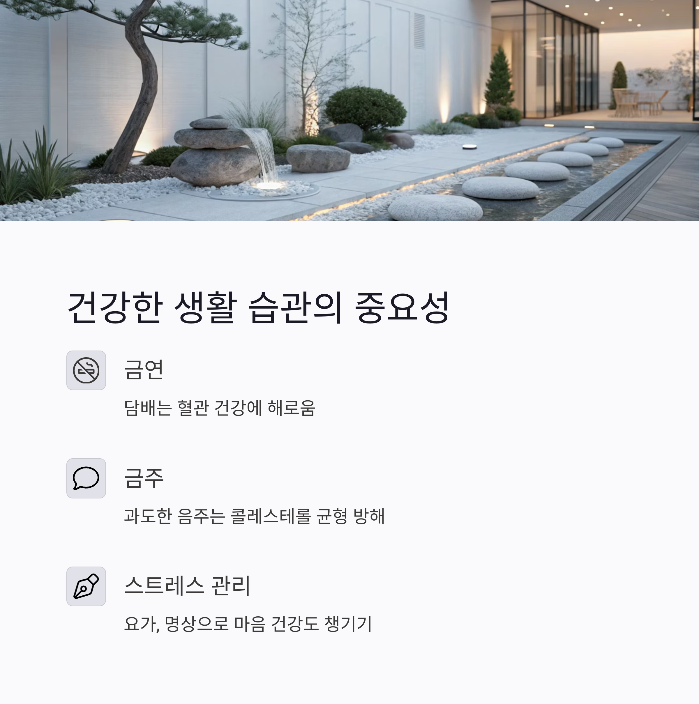 술과 담배는 혈관 건강에 정말 해롭거든요. 스트레스 관리도 중요한데, 요가, 명상 등 마음을 편안하게 해주는 활동을 통해 스트레스를 줄이는 것도 좋은 방법입니다. 그리고 적정 체중을 유지하는 것도 혈관 건강에 큰 도움이 됩니다. 비만은 여러 가지 건강 문제를 유발할 수 있으니, 건강한 체중을 유지하기 위해 노력하는 것이 중요합니다. 운동과 건강한 생활 습관은 단순히 HDL 콜레스테롤 수치 개선뿐 아니라 전반적인 건강 증진에도 큰 도움이 됩니다. 꾸준함이 최고의 무기라는 사실, 잊지 마세요.